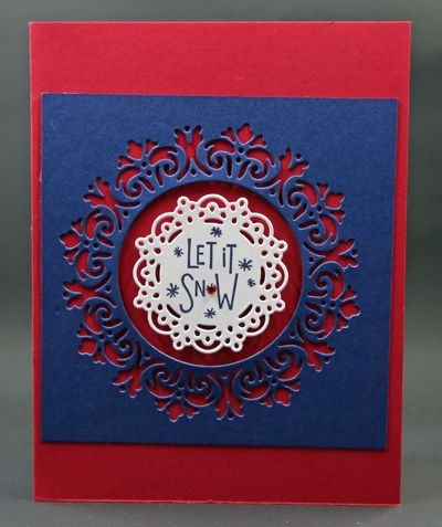 3. Ink “Let it Snow” sentiment using Night of Navy Classic Ink; stamp onto Basic White CS. Cut out using Encircled In Friendship Dies and the Stampin’ Cut & Emboss Machine. See photo and match the die. Adhere it to the Card Base using Stampin Dimensionals.
